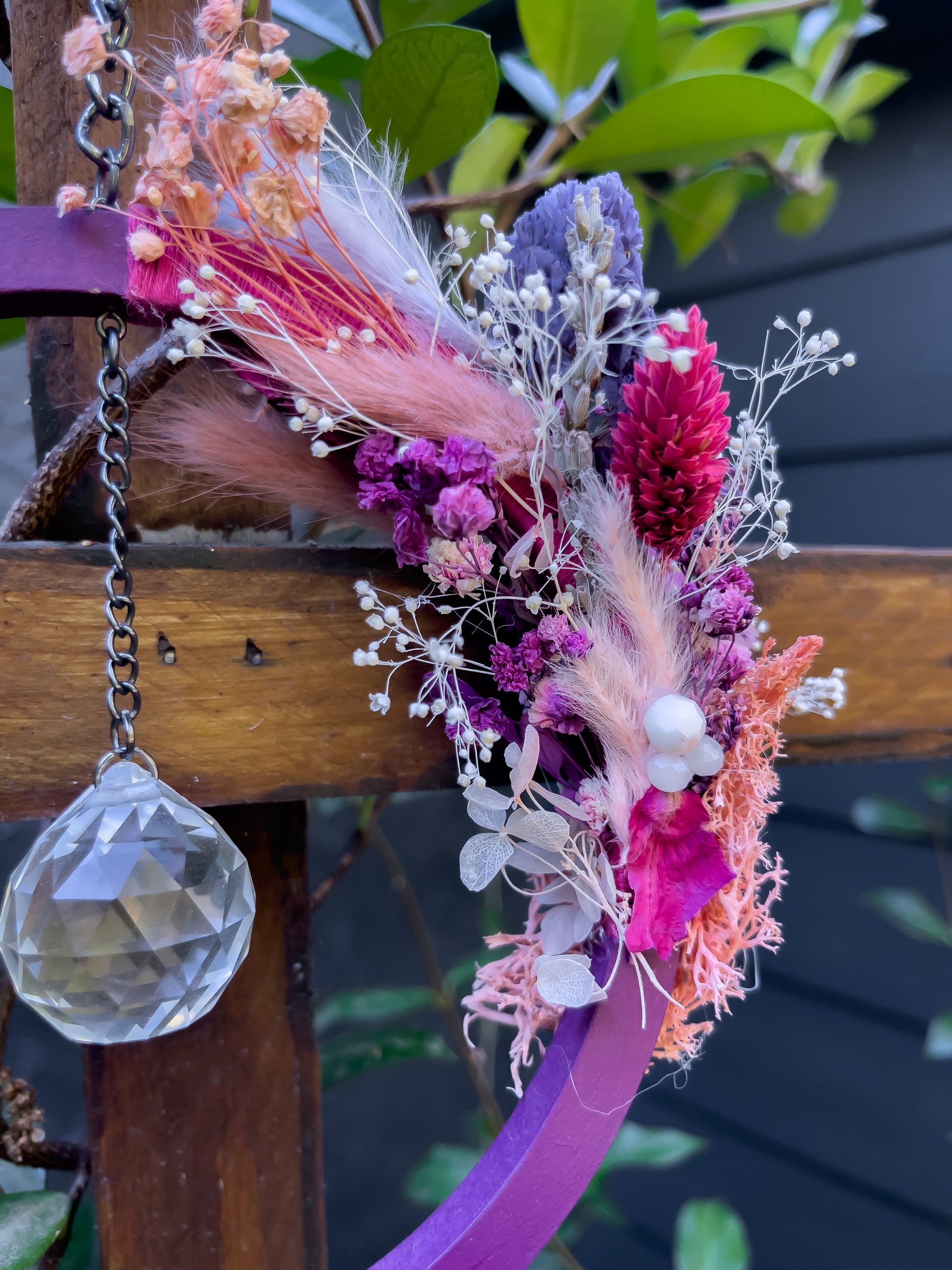 Unique 6” Suncatcher wreath with real preserved flowers.